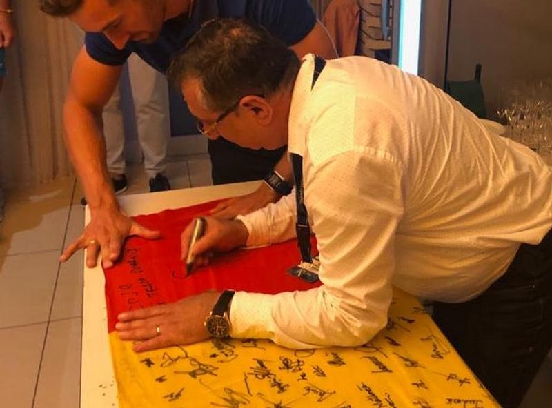 Oficialul COSR a raspuns invitatiei canotorilor si a semnat in numele Team Romania pe drapelul tricolor cu semnaturile celor care au calificat barcile la Tokyo 2020.