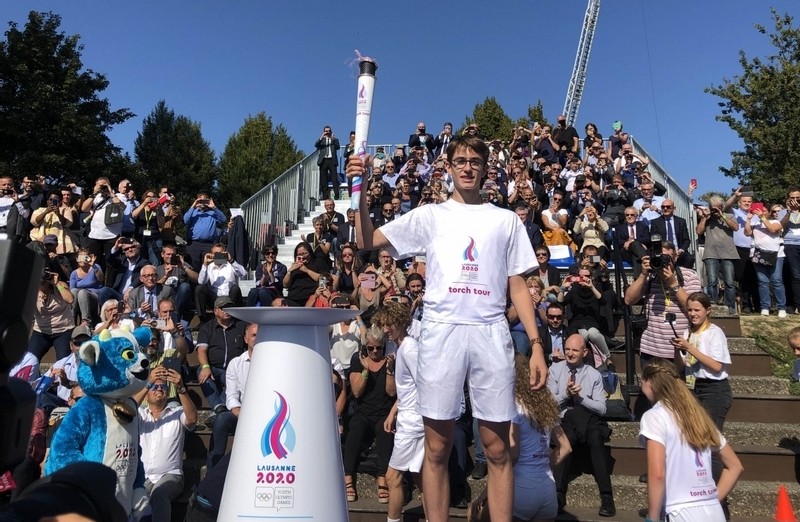 Flacara Olimpica a JOT Lausanne 2020, aprinsa pe stadionul Pierre-de-Coubertin din Lausanne, inainte de startul Stafetei prin Elvetia