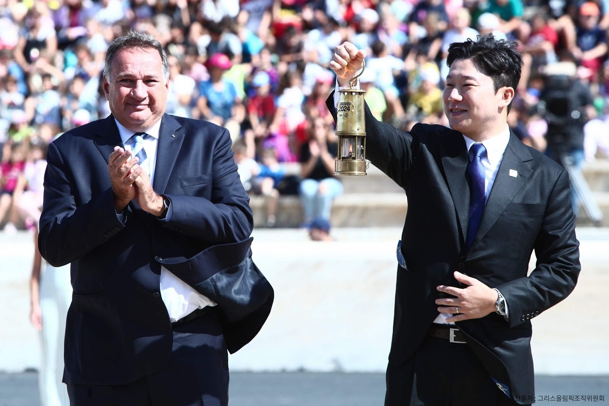 Flacăra a fost apoi introdusă într-o lampă de siguranță pentru a fi transportată în Coreea de Sud, iar Spyros Capralos, președintele Comitetului Olimpic din Grecia, i-a înmânat-o copreședintelui Comitetului de Organizare Gangwon 2024 Jin Jong-oh, de patru ori medaliat cu aur la tir, cel mai de succes sportiv coreean din istoria olimpică, născut în Chuncheon, capitala provinciei Gangwon.