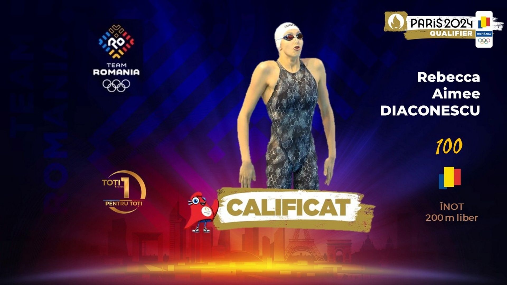 Înotătoarea Rebecca Aimee Diaconescu a primit biletul olimpic după alocarea unui loc de universalitate din partea forului internațional de natație (World Aquatics). La Paris 2024, înotătoarea română născută la Las Vegas, în Statele Unite ale Americii, va concura în proba de 200 m liber.